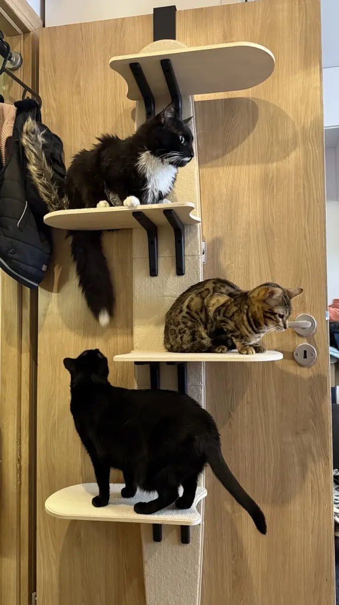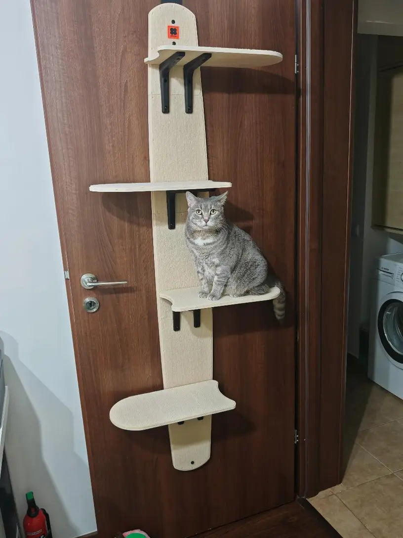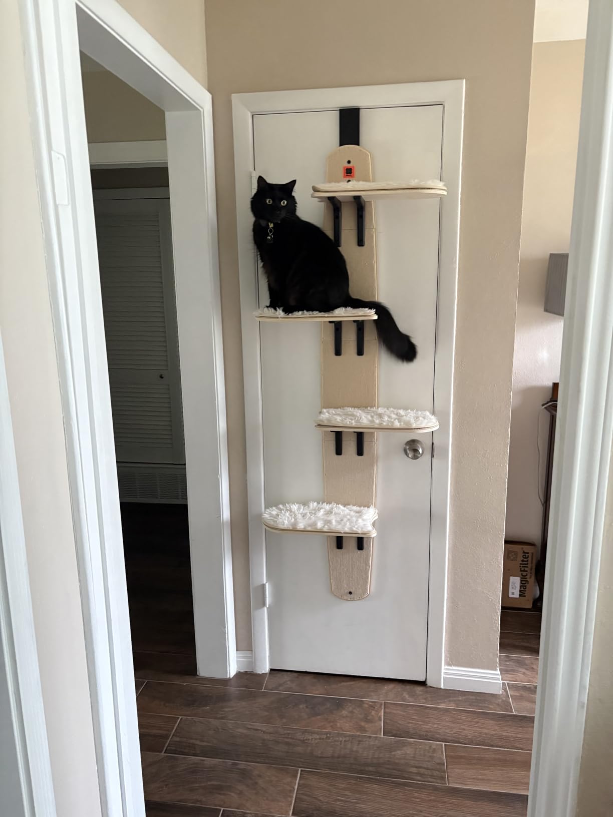 Mi apartamento es pequeño y no tenía espacio para un árbol grande para gatos. Este es perfecto: se cuelga de la puerta y no ocupa espacio. Mi gato lo sube todos los días y le encantan los cojines para dormir. Es muy resistente y está muy bien diseñado ."